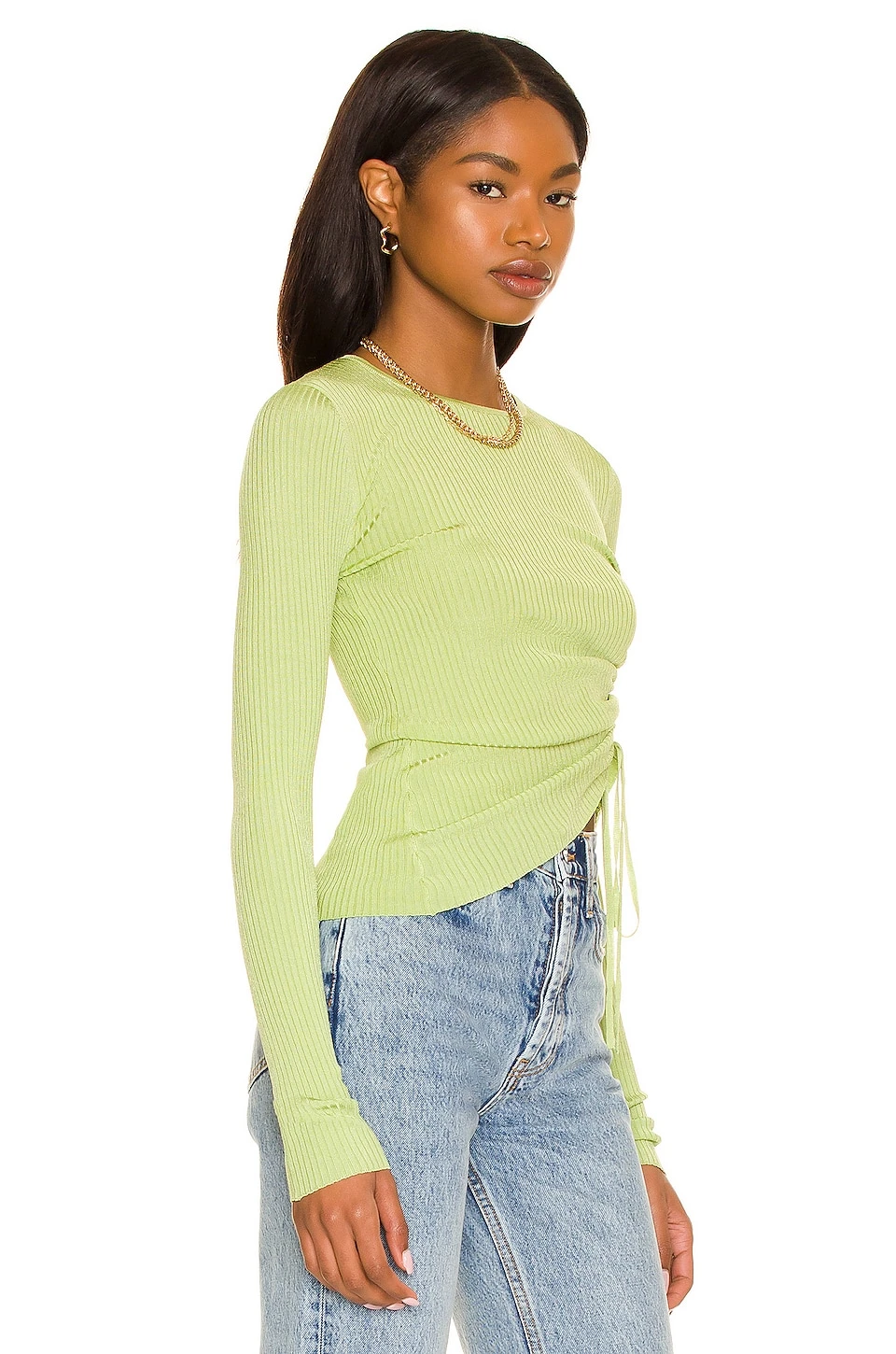 - Ruched drawstring side with asymmetric hem